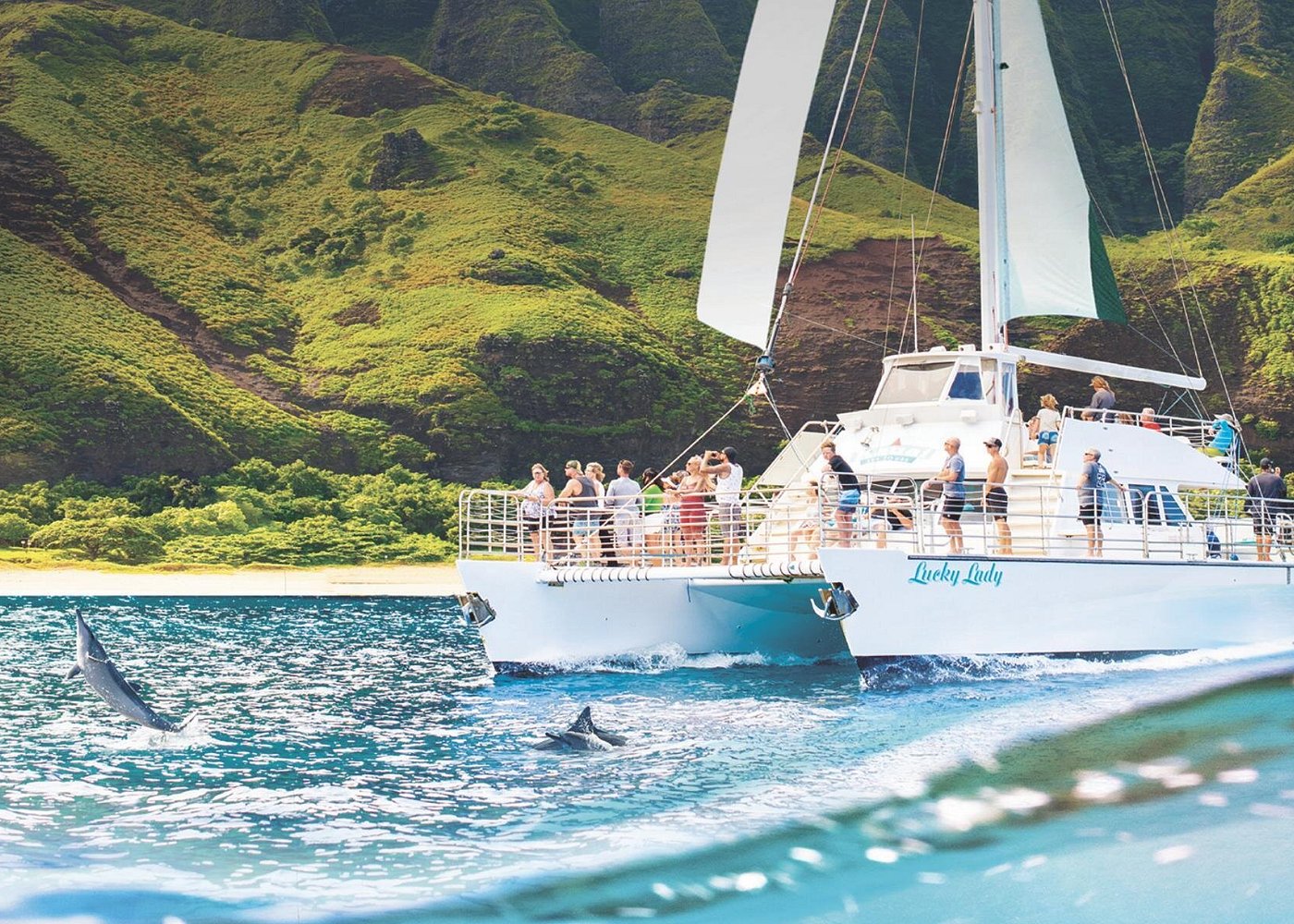 The Deluxe Na Pali Morning Snorkel Tour on the Lucky Lady is an unforgettable adventure along Kauai’s breathtaking Na Pali Coast. Enjoy stunning views of towering cliffs, waterfalls, and hidden beaches, plus encounters with dolphins, sea turtles, and seasonal whales. Dive into crystal-clear waters for a top-notch snorkeling experience, all aboard a spacious, well-equipped catamaran with delicious food, drinks, and a friendly crew. With rave reviews and unmatched scenery, this 6-hour tour is a must for nature lovers and adventure seekers!
